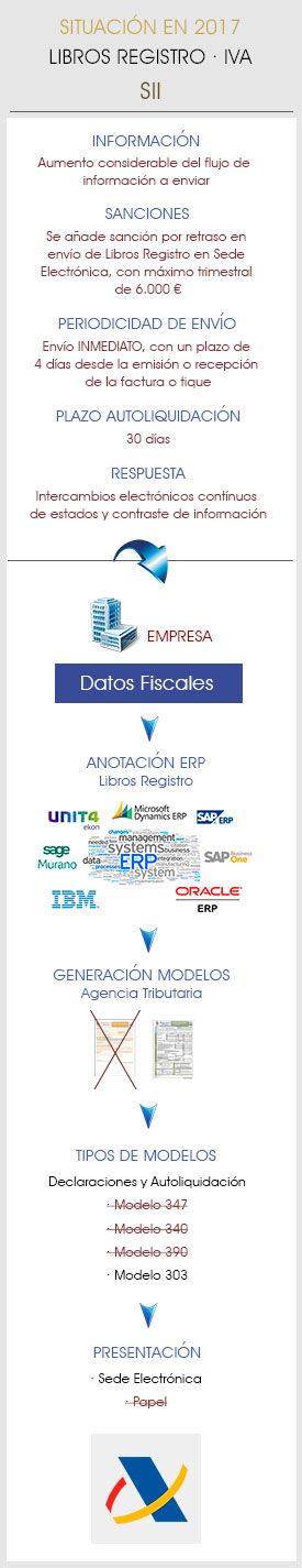 Con la implantación del SII cambiará el sistema de transferencia de datos de los Libros Registro de IVA. Será obligatorio enviar los registros de facturación electrónicamente, mediante la Sede Electrónica de la AEAT. Ya no serán necesarios los Modelos 347, 340 y 390, y el plazo de presentación de las autoliquidaciones se ampliará a los primeros 30 días naturales del mes siguiente al período de liquidación, ya sea mensual o trimestral.