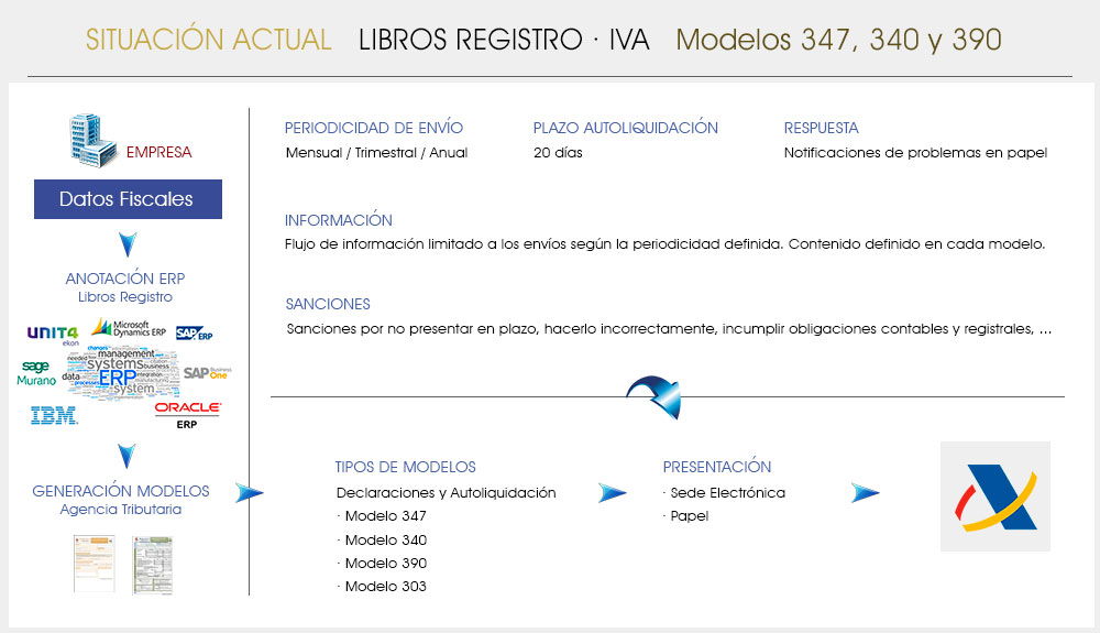 Actualmente las empresas presentan periódicamente los modelos 347, 340 y/o 390 con los datos de facturación, operaciones en libros registro y resumen anual del IVA. AL final del año también deben presentar la autoliquidación (modelo 303). La periodicidad puede ser mensual, trimestral o anual.