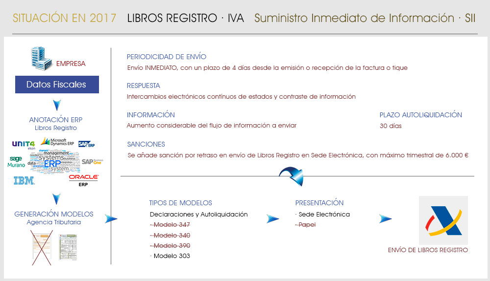 Con la implantación del SII cambiará el sistema de transferencia de datos de los Libros Registro de IVA. Será obligatorio enviar los registros de facturación electrónicamente, mediante la Sede Electrónica de la AEAT. Ya no serán necesarios los Modelos 347, 340 y 390, y el plazo de presentación de las autoliquidaciones se ampliará a los primeros 30 días naturales del mes siguiente al período de liquidación, ya sea mensual o trimestral.